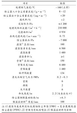 (2) 新建布袋除塵及氣力輸灰管道式渦街流量計。采用長袋低壓脈沖袋式(外濾式)除塵器,煙氣體積流量為 210 000 m 3 /h,初 始 含 塵 質 量 濃 度 為 8 ~12 g/m 3 ,除塵占地面積為 20 m 2 (5 m ×4 m)。除塵器主要由本體、壓縮空氣系統、控制系統、輸灰系統組成。除塵器后進脫硫塔煙塵質量濃度≤20 mg/m 3 。除塵器的總阻力≤1 200 Pa。新建布袋除塵器型號為 LCMD-4934,設計參數見表 2,其中清灰方式采用離線清灰,除塵器布置方式為矩形布置,電氣控制采用可編程邏輯控制器(PLC)。
