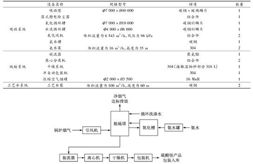 工藝系統主要包括煙氣系統、SO 2 吸收系統、吸收劑供給系統、氧化空氣系統、硫酸銨后處理系統、工藝水系統、檢修排空系統、硫酸銨儲存系統(見表 4)。