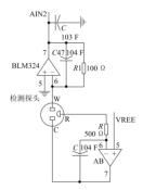 煙氣脫硫排放效果采樣模塊使用結(jié)構(gòu)簡單、響應(yīng)快、選擇性能好的 SO 2 -2000 傳感器,該傳感器為三極電化學(xué)傳感器,其 3 個(gè)引腳對應(yīng) 3 個(gè)電極:工作電極 W、參考電極 R 和對電極 C。SO 2 -2000 傳感器利用工作電極與循環(huán)流化床dn150渦街流量計(jì)排放煙氣中的二氧化硫形成氧化反應(yīng),使工作電極上生成電流,電流強(qiáng)度同循環(huán)流化床dn150渦街流量計(jì)排放煙氣中二氧化硫濃度間成正比關(guān)系。由此通過對工作電極上電流的檢測即可計(jì)算出循環(huán)流化床dn150渦街流量計(jì)排放煙氣中二氧化硫的體積濃度。在氧化反應(yīng)過程中,參考電極的主要作用是穩(wěn)定工作電極電勢。模數(shù)轉(zhuǎn)換裝置采用型號為 S3C2440A 的 ADC轉(zhuǎn)換器,以電壓替代傳感器工作電極上的輸出電流,進(jìn)入 ADC 轉(zhuǎn)換器即可獲取循環(huán)流化床dn150渦街流量計(jì)排放煙氣中二氧化硫濃度的數(shù)字量。圖 3 所示為SO 2 -2000 傳感器的測量電路。
