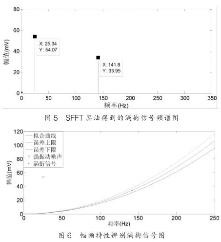 從圖 5 可以看出 SFT 算法能夠很好恢復,對渦街信號的頻率恢復沒有誤差,而幅值的誤差不超過 1% ,這對含有強振動噪聲的渦街信號精確測量至關(guān)重要;圖 6 是經(jīng) SFT 頻譜分析所得到的數(shù)據(jù)通過幅頻特性曲線來辨別是噪聲信號還是渦街信號。通過幅頻關(guān)系的信號處理方法可以從含有振動的混合信號中識別渦街信號,從而達到提高液化氣流量計抗振動性能的目的。