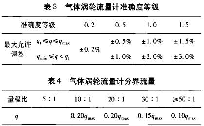 在GB21391--2008《用氣體渦輪流量計(jì)測量天然氣流量》對分界流量q,有明確的定義,即低于該流量要采用擴(kuò)展誤差限的流量值。標(biāo)準(zhǔn)*5.2條從*大允許誤差和量程比兩方面對分界流量做出了規(guī)定,且明確了量程比是在*大允許誤差范圍內(nèi)流量計(jì)的*小流量和*大流量之比。該標(biāo)準(zhǔn)中對渦輪流量計(jì)要求的*大允許誤差如表1所示,量程比與分界流量q,的關(guān)系如表2所示。
