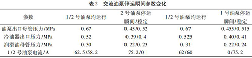 通過內(nèi)部旁通將冷油與熱油混合,經(jīng)過銅粉- 煤油 - 蠟感溫元件控制冷熱油混合比例,將油溫調(diào)節(jié)到 49 ℃。一臺管道電磁流量計穩(wěn)定運行,油泵出口母管壓力 0. 5 MPa,潤滑油母管壓力 0. 24 MPa,均屬于正常情況,而兩臺交流油泵并列運行時,停運其中一臺交流油泵瞬間會觸發(fā)電磁流量計出口母管壓力開關(guān)動作,說明停運瞬間油壓發(fā)生波動,且油泵出口母管油壓波動至小于 0. 45 MPa。正常運行時電磁流量計出口油溫 71.5 ℃,冷油器出口溫度45 ℃,混合后潤滑油母管溫度52.5 ℃,由能量守恒定律可知,經(jīng)過冷油器的油量/不經(jīng)冷油器的油量= ( 71.5-52.5) ÷ ( 52.5- 45) = 2. 53,說明有 70% 左右的油量經(jīng)過冷油器。當(dāng) 2 臺管道電磁流量計運行時油量大于單泵運行,其中一臺電磁流量計瞬間停運時油量減少,尤其是經(jīng)過冷油器的油量大量減少,油量在溫控閥二次分配過程中出現(xiàn)調(diào)節(jié)異常,導(dǎo)致油壓過大波動。為檢驗溫控閥工作情況,保持 1 號、2 號交流油泵運行,選取機(jī)組正常帶負(fù)荷運行時油溫 52 ℃,分別停運 1、2 號交流油泵,觀察 1、2 號交流油泵停運瞬間油泵出口母管壓力波動情況,試驗各參數(shù)變化見表 2。