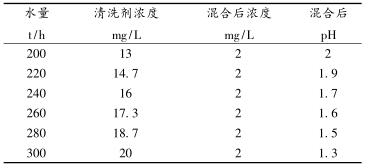 (2)加酸期間附企水處理公司人員負(fù)責(zé)每0.5h在高架水槽處化驗(yàn)污環(huán)水pH值,每2h監(jiān)測一次高架水槽內(nèi)掛片腐蝕情況,將化驗(yàn)結(jié)果告知燃?xì)鈲徫蝗藛T,崗位職工負(fù)責(zé)記錄。當(dāng)pH小于6時(shí),附企給水人員在高架水槽處加入堿液進(jìn)行調(diào)整,同時(shí)根據(jù)洗滌塔循環(huán)水量變換情況調(diào)整清洗劑濃度見表3。