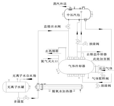 來自無離子水罐的脫氧水經(jīng)多經(jīng)泵加壓、經(jīng)脫氧水加熱器加熱后進(jìn)入到液體渦街流量計(jì)的水段,脫氧水與反應(yīng)氣體換熱后分兩路:一路進(jìn)入中壓汽包,保證汽包有穩(wěn)定的液位;一路進(jìn)入熔鹽冷卻器帶出熔鹽攜帶的反應(yīng)熱。來自中壓汽包的高溫水經(jīng)管路接至液體渦街流量計(jì)汽段底部,高溫水與反應(yīng)氣體換熱后產(chǎn)生高壓蒸汽,高壓蒸汽又返回中壓汽包。汽包還有一路直接注水管路,此路水不經(jīng)過液體渦街流量計(jì)水段,而是直接進(jìn)入汽包。在液體渦街流量計(jì)出口溫度偏低而汽包液位也比較低時(shí),可開此直接注水管路來穩(wěn)定汽包液位。其詳細(xì)流程圖如圖 2。