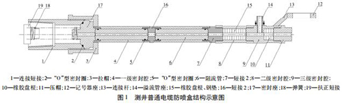 注入剖面測(cè)試中,溢流量對(duì)測(cè)量結(jié)果影響至關(guān)重要。如圖 1 所示,測(cè)井普通防噴盒采用 3 級(jí)密封: * 1 級(jí)密封為阻流管( 6) ,測(cè) 20 井次左右阻流管內(nèi)徑變大,溢流量增加; * 2 級(jí)為橡膠盤根和鋼墊( 15) ; * 3 級(jí)為橡膠盤根( 10) ,調(diào)整壓帽( 11) 松緊程度,橡膠盤根抱緊電纜; * 2 級(jí)和* 3 級(jí)密封更換一次橡膠盤根測(cè)試 3 ~ 5 井次溢流量增加。普通防噴盒無法實(shí)現(xiàn)溢流量,沒有捕捉器、防噴器和放噴組裝件。普通電纜防噴裝置工作壓力20 MPa,耐壓 40 MPa。
