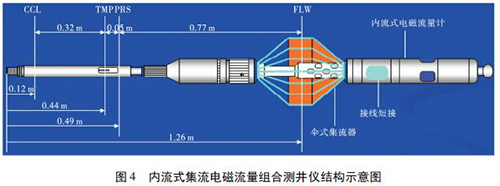1. 2 內(nèi)流式集流智能型渦輪流量計(jì)如圖 4 所示,內(nèi)流式集流電磁組合測(cè)井儀主要采用內(nèi)流式集流智能型渦輪流量計(jì),并組合了井溫壓力磁定位儀。利用電磁感應(yīng)原理測(cè)量平均流速,體積流量計(jì)算公為: