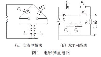差壓液位變送器的測(cè)量電路如圖1所示,變送器的輸出可以轉(zhuǎn)換成電壓、電流或頻率等信號(hào),然后放大。圖1(a)的交流電橋法是將兩個(gè)電容器接于交流電橋的兩個(gè)相鄰臂上,交流電橋的輸出經(jīng)放大與相敏檢波后進(jìn)行測(cè)量。圖1(b)的雙T網(wǎng)絡(luò)法壓差引起的電容變化轉(zhuǎn)換成電壓變化輸出。在交流電源正半周時(shí),通過二極管D1對(duì)電流器C1進(jìn)行充電,在負(fù)半周時(shí),電容器C1經(jīng)電阻R1與R3進(jìn)行對(duì)地放電;而電容器C2 則在電源的負(fù)半周充電、正半周對(duì)R3 與R2 反向放電。因此R3上兩端的電壓輸出是由C1與C2的平均放電電流之差所決定的。當(dāng)壓差為零時(shí),C1、D1、R1與C2、D2、R2的參數(shù)相同,則通過R3的平均放電電流之差為零。當(dāng)壓差不等于零時(shí),差動(dòng)電容C1與C2一個(gè)增大一個(gè)減小,使兩者的平均放電電流不相等,因此R3兩端的電壓輸出也就有了相應(yīng)的變化。