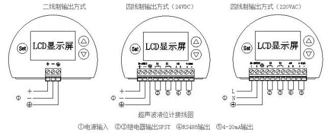 智能超聲波液位計(jì)具有三種輸出方式,在進(jìn)行接線時(shí),請(qǐng)按照下圖所示的接線方式進(jìn)行安全接線。