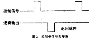 其外部特性如圖2所示。其工作原理是,每當(dāng)在“控制信號”端加一正脈沖(寬度0.2ms),控制卡便通過換能器發(fā)一束超聲波,當(dāng)超聲波遇被測污水反射后又被換能器接收,控制卡便通過“邏輯輸出”端輸出一“返回脈沖”。通過計量“控制信號”到“返回脈沖”之間的時間T便可按下式計算出換能器距被測污水表面的距離H,由于安裝時換能器固定在污水的上方(高度不變),因此,換能器距污水底部的距離HO(其值已知)減去H即為污水液位H1。