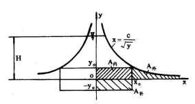即縱坐標(biāo)y值趨近于零時,橫坐標(biāo)x值趨近無窮大。這在堰板的實際制作上是無法實現(xiàn)的。若將堰口曲線的*低縱坐標(biāo)取為yo,在yo一下至(-yo)增開一矩形,即高為2yo,寬為2x。的補償孔,從數(shù)學(xué)上可以證明,坐標(biāo)原點以下所增大的矩形面積(A補)正好等于舍去的曲邊面積(A補)。由圖3可知