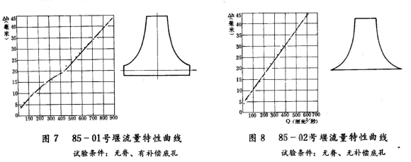 用85-01號和85-02號兩種雙曲線薄壁堰,在試驗水槽端安裝成無脊有補償孔和無補償孔兩種情況,進行了多次實驗,所得數(shù)據(jù)通過整理,畫出流量特性曲線,見圖7和圖8。