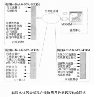 本文介紹的水體污染狀況在線監(jiān)測及數(shù)據(jù)遠(yuǎn)程傳輸網(wǎng)絡(luò)可以連續(xù)、自動監(jiān)測排污口的污水流量和水質(zhì)參數(shù),既可以分別顯示污水流量的瞬時值/日平均值/月平均值、pH/溶解氧/電導(dǎo)率/濁度/水溫/COD/TOC/NH4-N/**3-N等常規(guī)參數(shù),也可以實(shí)時計算污染物排放總量并經(jīng)公共通信網(wǎng)絡(luò)(電話線路)傳輸至區(qū)(縣)、市級的監(jiān)控中心,在轄區(qū)的電子地圖(GIS)上動態(tài)顯示各排污口的*新數(shù)據(jù),是環(huán)保、市政、水利等監(jiān)理部門實(shí)時觀測轄區(qū)水質(zhì)變化情況的現(xiàn)代化管理工具。系統(tǒng)組成如下: