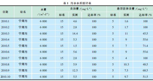 以一礦為例,2010年1~10月寧海污水站累計處理污水187萬m3,日均6200m3,1~10月份外輸污水含油累計達標(biāo)率100%,外輸懸浮物累計達標(biāo)率69.7%(見表1)。