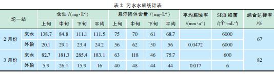 2011年2月坨一站來水含油平均183.1mg/L,外輸含油平均16mg/L,懸浮固體平均8.3mg/L,平均腐蝕率0.017mm/a,SRB 細菌平均6個/mL。只有懸浮固體含量超標(biāo)。