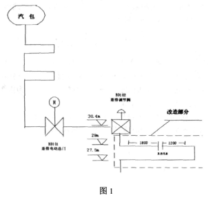 異形孔板安裝在鍋爐30米處連排管段,截去一段加裝U形管段的來流直管段上,根據安裝要求,測點位置選在距離上游直管段1810mm,距離下游直管段1085mm處。符合“距離上游直管段>10D(D=56mm,管道內徑),距離下游直管段>5D”的要求??装宓娜汗転榇怪毕蛳?,圓缺孔板的弦與管道橫截面水平中心線平行安裝。其改造安裝圖如圖1所示。