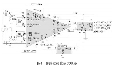 IC2(SL28617)放大器用于放大傳感器送來)放大器用于放大傳感器送來的反映流量大小的電壓信號,圖中的反映流量大小的電壓信號,圖中Rin和Rfb是用來改變運算放大器增益的電阻。來改變運算放大器增益的電阻。S1是勵磁信號源,R17、R18是輸入偏置電阻,運放的是輸入偏置電阻,運放的9腳和16腳分別接電源±腳分別接電源±5V,接在運放IC2輸出端的IC3(ADS8320 ADS8320)是16位高速A/D轉換器,其轉換速度可達16kHz/s,接在接收放大器與接在接收放大器與A/D轉換器之間的IC12(ISL21090 ISL21090)是三端穩(wěn)壓器。電路如圖)是三端穩(wěn)壓器。電路如圖4所示。