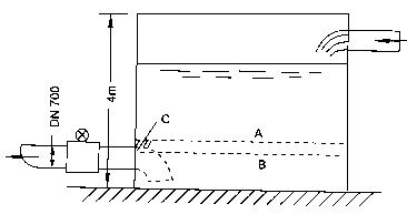 案例4 廣西某水廠在郊區(qū)山頭設(shè)置清水池,利用水池高度勢能發(fā)送成品水。運行人員反映計量出水量的DN700mm酸堿污水流量計有時候流量顯示不穩(wěn)?;蝿舆_(dá)百分之十幾到百分之二十,誤差也大,估計相差約20%?,F(xiàn)場考查發(fā)現(xiàn)水池如圖7-9所示安裝流量傳感器,水位高度不足就會卷入氣泡,甚至流量傳感器測量管內(nèi)不能充滿。如水位降至A線時,雖高出吸入口頂端,但高出不多,還會在C處產(chǎn)生旋渦,將水位表面空氣卷入形成氣泡,使顯示晃動;若水位降到B,測量管將不滿管。我們建議如圖虛線所示裝一彎頭,擴(kuò)大水池有效容量,減少吸入氣泡的機(jī)會,彌補(bǔ)原設(shè)計的不足。這類實例是經(jīng)常遇到的。